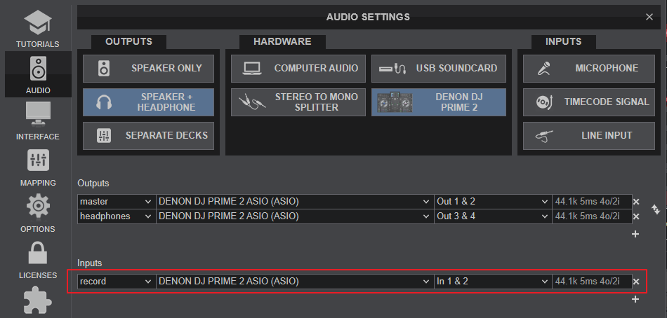 The Denon DJ Prime 2 offers a dedicated Record input and this is part of the default Audio setup. As long as the setup is as per the following image (includes the Record line to Chans 1,2), your mix will be recorded including the signal from the Microphone and AUX inputs.