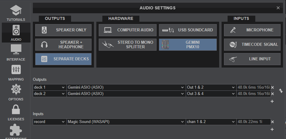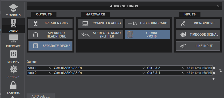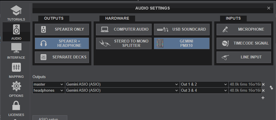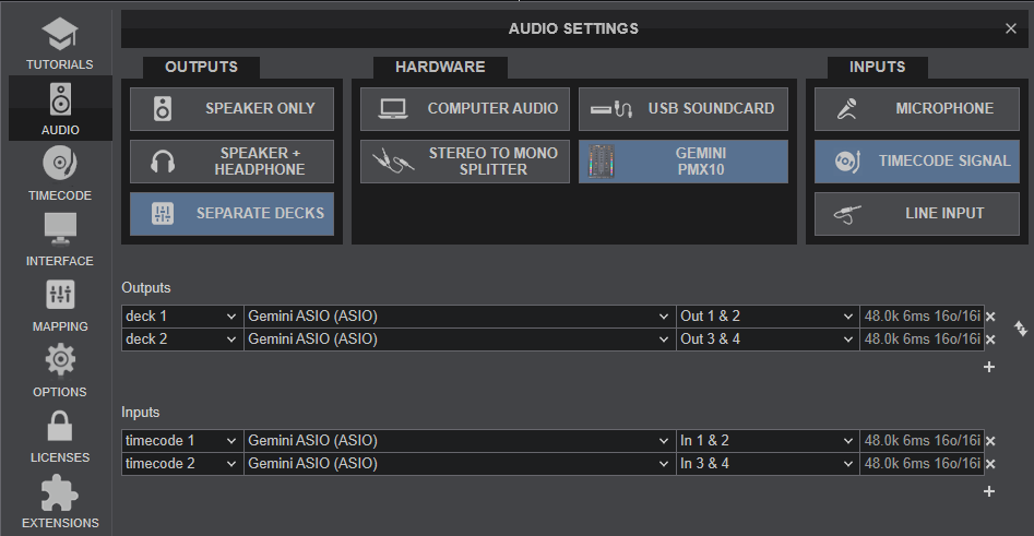The special GEMINI PMX10 button in the Audio Setup tab of VirtualDJ Settings is always offering the audio configuration of the default - Hardware/Mixer mode.