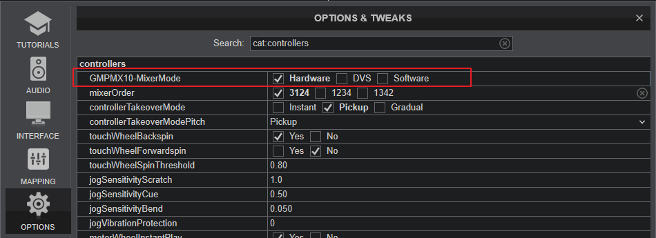Select Software for MIDI Mixer Mode, or Hardware (or DVS) for Hardware Mixer mode