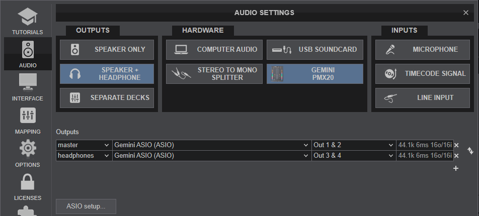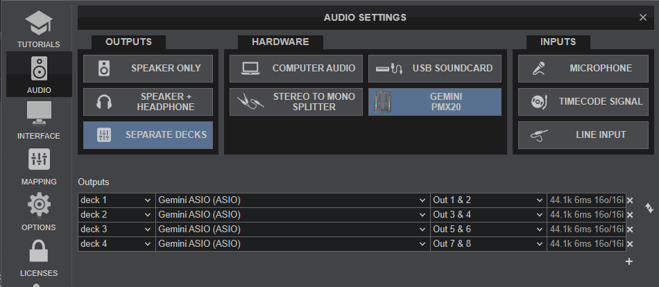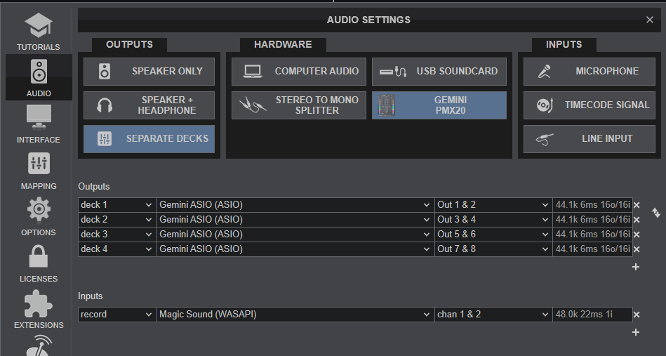 In this mode the USB Audio Interface of the Gemini PMX20 turns into 4out/4in channels, offering control of 2 VirtualDJ Decks (the middle ones) along with DVS/Timecode controls. The outer PMX20 mixer channels 3 and 4 can be used to route signal from externlal sources, but cannot control any VirtualDJ Deck.