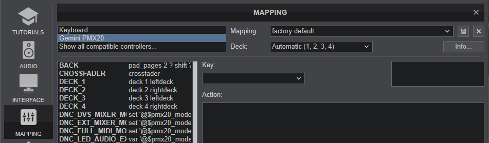 The unit should be visible in the CONTROLLERS tab of Config and the “factory default” available/selected from the Mappings drop-down list. The factory default Mapping offers the functions described in this Manual, however those can be adjusted to your needs via VDJ Script actions.