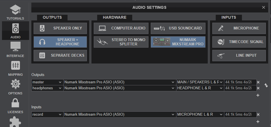 The Numark Mixstream Pro offers a Microphone input and a Volume control knob at the front panel. The Microphone input is not part of the USB Audio Interface and is routed directly to the Main output, thus is not included in VirtualDJ Audio setup but its signal will be recorded along with your Mix.