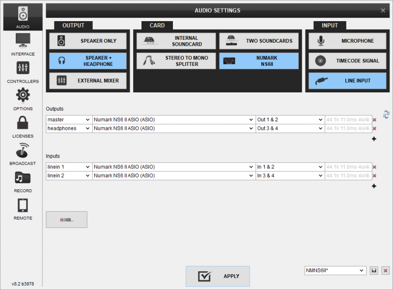 Besides using CH3 and CH4 as a stand alone hardware mixer, Numark NS6II offers you the option to route the audio of it's analogue inputs inside VirtualDJ. Simply create the following audio setup by clicking on the "Line Inputs" button under VirtualDJ Audio setup window: