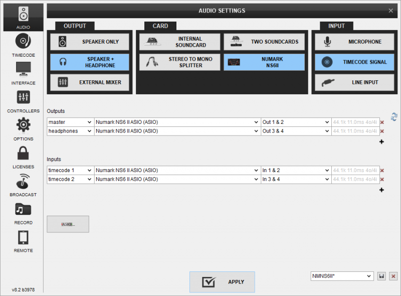 Numark NS6II offers the ability to control up to two software decks by using timecodes. Simply create the following audio setup by clicking on the "Timecode Signal" button under VirtualDJ Audio setup window: