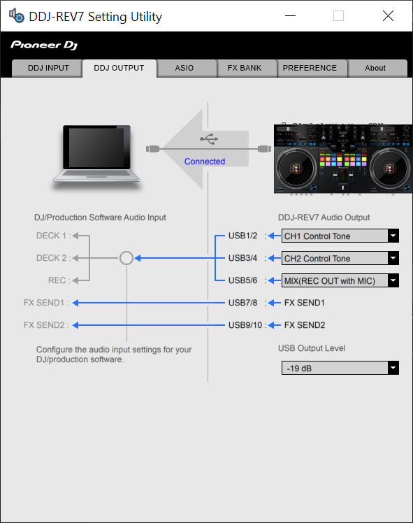 The USB Output Channels can be set to different modes via the Pioneer DDJ-REV7 Setting Utility application.