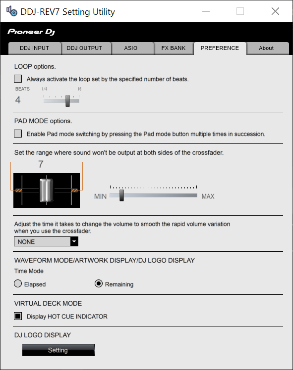 The Pioneer DJM-REV7 Setting Utility application offers a few advanced options to choose from, such as the behavior of the LOOP buttons, the adjustment for the Crossfader behavior and how the Pad mode buttons will be selected.