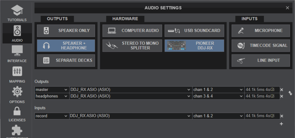 Once the DVS On Pad is selected, go to VirtualDJ Settings->AUDIO tab and click on the Pioneer DDJ-RX DVS special button at the top of the window to auto-create the sound setup for this mode as per the following image.