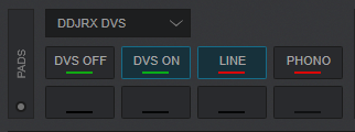 The Pioneer DDJ-RX is offering a built-in sound card which can operate in 2 modes. The default Controller (no-DVS) mode and the DVS Mode. The mode selection can be done via a special DDJRX DVS Pad Page. This Pads page will not be available if the DDJ-RX is not connected.