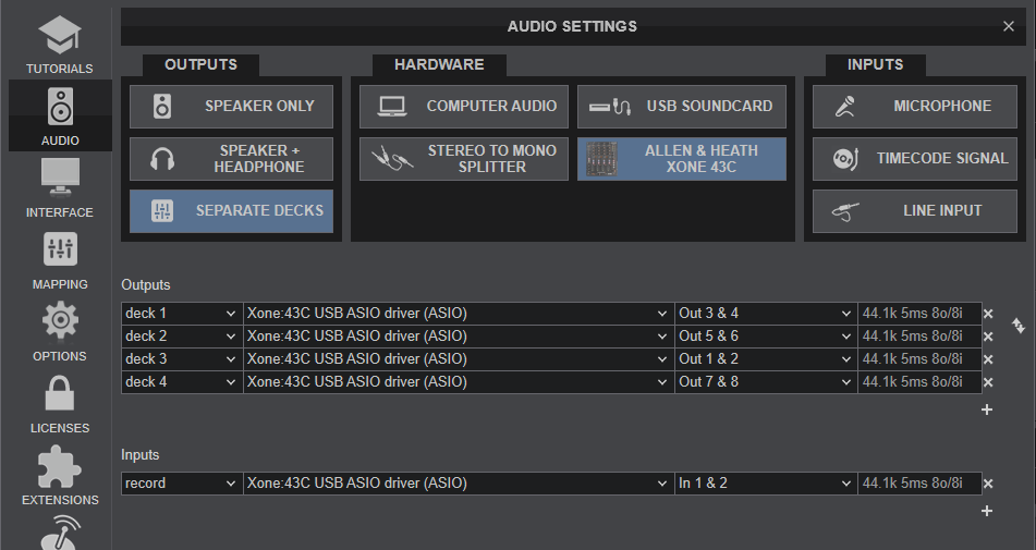 The Xone 43C offers 4 stereo input for the USB Audio interface which can be used to connect up to 4 Timecode (Vinyl or CD) devices.
