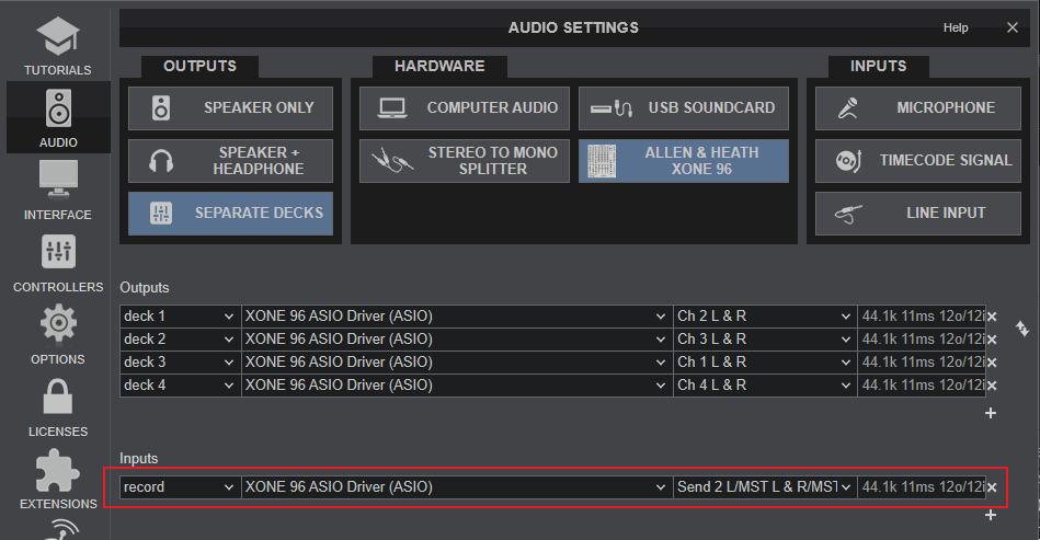 The Xone 96 offers 4 stereo inputs suitable for Timecode (DVS) control to 4 VirtualDJ Decks, using CH Inputs 1 to 4. Read further information for Timecode Inputs at VirtualDJ Manual