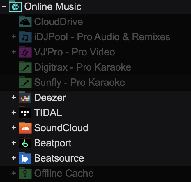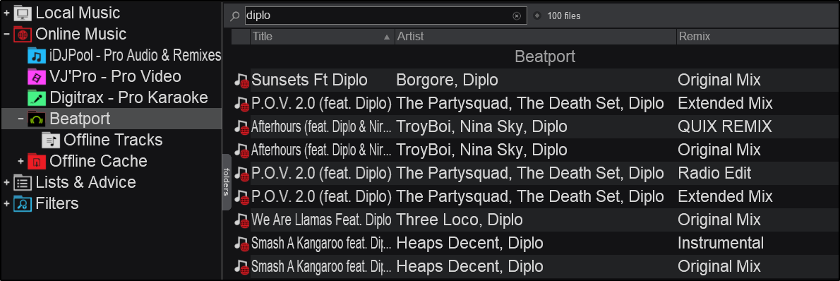 You can now use the root Beatport folder to search their catalog directly from the VirtualDJ search bar. Expanding the Beatport folder using the button will also display your Offline Library and any playlists that you have created in the service.