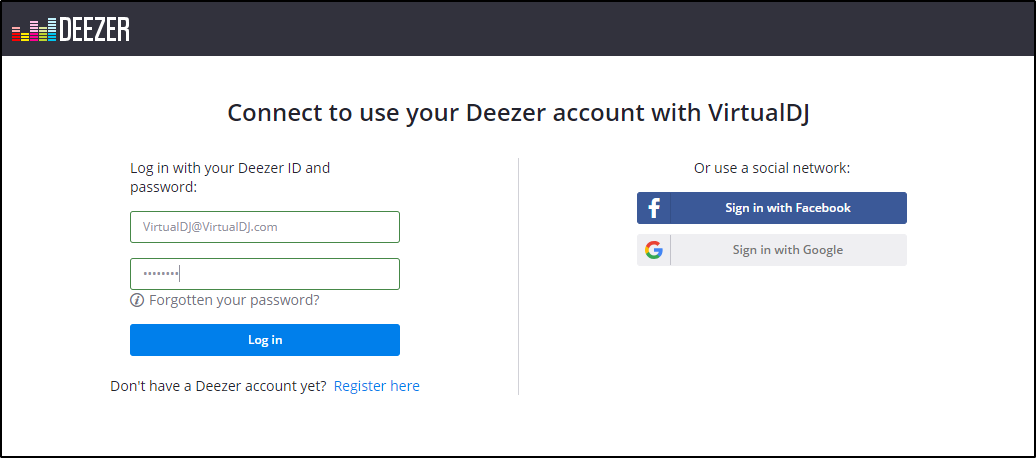 A browser window will open and the login screen will appear. Use your Deezer user account credentials to login or click on the other options to login with Facebook or Google.