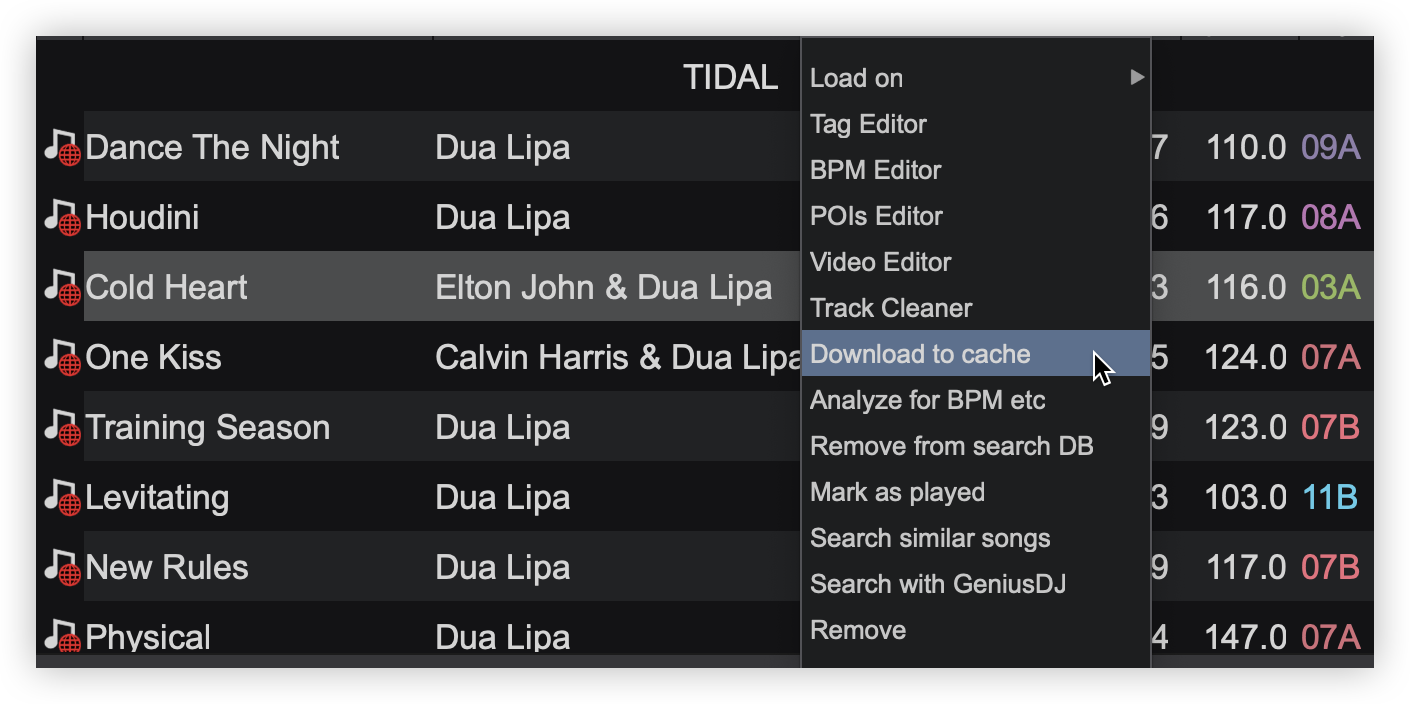 You can now use the root Tidal folder to search their catalog directly from the VirtualDJ search bar. Expanding the Tidal folder using the button will also display any playlists that you have created or subscribed to in the service as well as liked artists, songs and playlists.