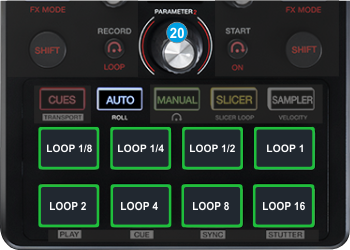 Press the AUTO mode button to set the Pads to Auto Loop mode. The PADS section of the default VirtualDJ GUI will be automatically set to the Loop page.