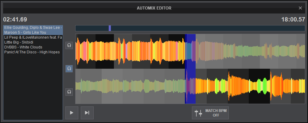 - Continue to adjust each automix point as required, using the mouse to zoom in and out to make fine adjustments while pre listening to the mix points. Highlight any mix point to toggle on/off Match BPM or Reset it to the original automix point.
