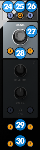 - BROWSE: Turn this knob to scroll through files or folders. Hold down SHIFT (13) and turn the knob to change the area of the browser that has the focus between folders, songs and sideview. Push the knob down to set the focus on the folders list or open / close subfolders if focus is on the folders list. Hold down SHIFT (13) and press the knob to set the focus on the songs list if the focus is on folders list.
