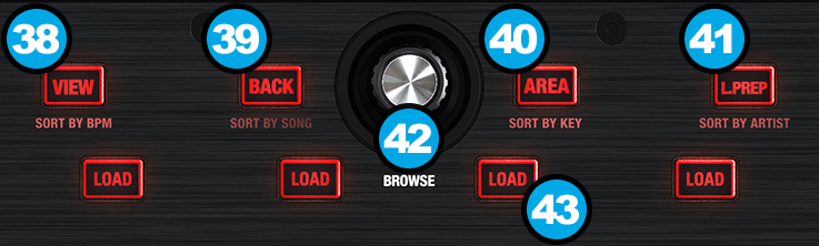 BROWSE ENCODER: Scrolls through Folders or Files. Push the encoder down while focus is on Folders window, to return to the songs window. Push the encoder down while on Songs or Sideview windows to load the selected track on the first available deck. Hold down SHIFT and turn the encoder to scroll 5 songs at a time.