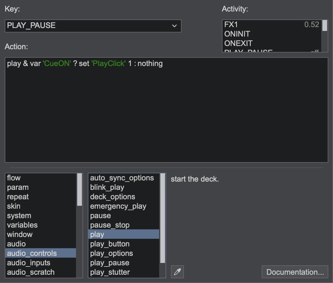 - DESCRIPTION - Provides a description of the current script. Additionally, there is a mapping tool (eye dropper) to the lower left of the box to easily pick out skin elements that a button could be mapped to, and automatically mapping the button with a few mouse clicks. To the lower right is a Documentation... button that will open a web browser and provide more details about VirtualDJ script actions and syntax.