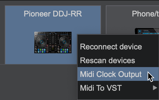 The connection icon provides the status of the device. When the controller is fully connected the icon will display in green. Clicking on the icon will provide options to reconnect devices, rescan for devices, and offer the ability for Midi Clock Output and/or Midi to VST. - PHONE/TABLET - Used to connect the VirtualDJ Remote Application to the software.