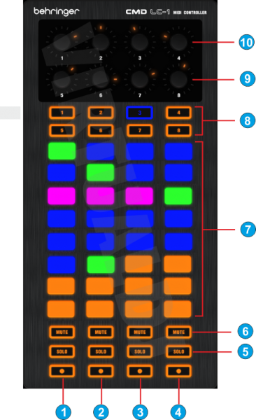 - PADS. The 32 pads trigger from 1 to 32nd samples of the selected bank, depending on the trigger pad mod. Press SHIFT (1) and then one of the pads to stop the playing sample. If a sample slot is assigned (loaded), the led of the button will turn on blue. If the sample is playing the led will turn on green. If no sample is assigned to a slot, the led will remain orange).