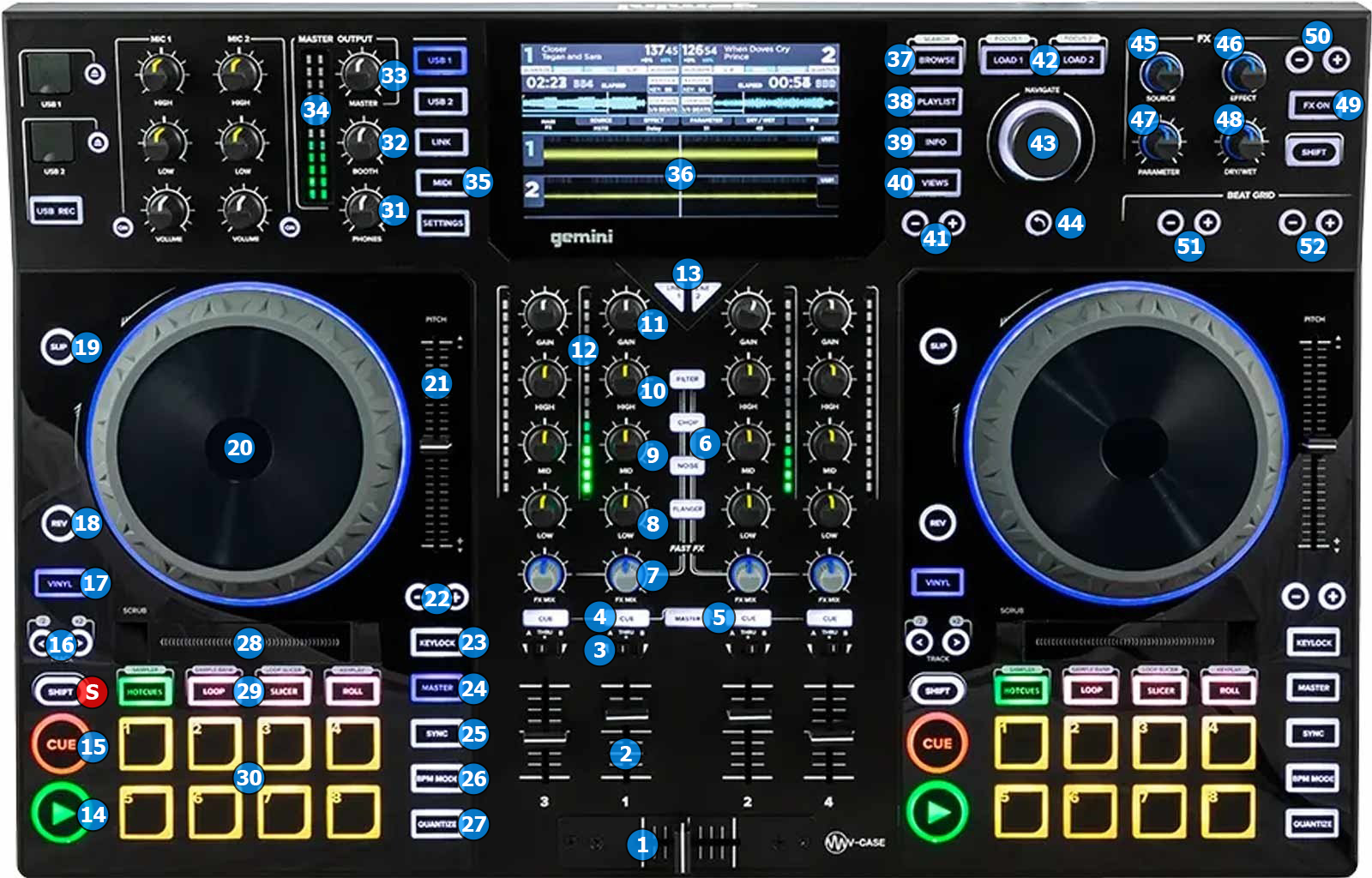 1 CROSSFADERWhen on far left position, only sound from the left decks will be heard from the Master Output. When at far right position, only the sound of the right decks will be heard from the Master Output. In all other positions, the audio signals from left/right decks will be blend.2 VOLUMEAdjust the Volume of the decks.3 CROSSFADER ASSIGNAssign the deck to the left or right side of the crossfader.4 PFLUse these buttons to send the pre-fader audio signal of the decks to the Headphones channel for pre-listening.5 MASTER PFLUse this button to quickly send the master audio signal to the Headphones channel for pre-listening.6 COLOR FX SELECTPress one of these four buttons to select one Color Effect to apply on decks. The available effects are Filter, Cut, Noise & Flanger7 COLOR FX ADJTurn these knobs to apply the selected Color Effect on the sound of the deck. When in center, the Color Effect turns off.8 BASSUse these knobs to cut/boost the frequencies of the Low/Bass Equalizer Band. No adjustment is made when the knob is at the middle/center position.9 MEDIUMUse these knobs to cut/boost the frequencies of the Middle/Medium Equalizer Band. No adjustment is made when the knob is at the middle/center position.10 TREBLEUse these knobs to cut/boost the frequencies of the High/Tremble Equalizer Band. No adjustment is made when the knob is at the middle/center position.11 GAINUse these knobs to adjust the gain of each deck.12 VUMETERThis LED bar shows the pre-fader volume level of each deck.13 LINE1/2No functions are assigned here.14 PLAY/PAUSEPress this button to start or pause the playback of the deck.Press this button to start the playback of the deck or restart it from last start point (stutter).15 CUE/STOPPress this button stop the playback of the deck and return to the last cue point. Press this button while the deck is paused to store a temporary cue point.Press this button to return to the start of the track. 16 PAD PARAMETERSUse these buttons to control the first parameter of the selected pad page.Use these buttons to control the second parameter of the selected pad page.17 VINYLUse this button to toggle the JOG between Scratch and Bending modes.18 REVERSEPress this button to toggle playback between normal (forward) and reverse direction.Press this button to apply a momentary (while pressed) reverse effect. Upon release, the track will resume forward playback direction from the point it would have been if you hadn't used the button. 19 SLIPPress this button to toggle Slip mode. While Slip mode is active, hotcues, loops, beatjumps and scratchs have a temporary effect, and the tracks always returns to the position it would have been if those actions were never used.20 JOGTouch sensitive Jog for Scratching, or Bending.Use the JOG to seek quickly between different positions inside the track.21 PITCHAdjust the playback speed of the track.22 PITCH BENDPress these buttons to temporarily adjust the playback speed of the track (pitch bend). When you release the buttons the playback speed will return to the value dictated by the PITCH slider.Press these buttons to change the range of the pitch slider.23 KEYLOCKPress this button to lock the track's KEY to it's current value.24 MASTERPress this button to manually set this deck as the "MASTER" deck. Hold this button for 1 second in order to resume automatic master deck selection.25 SYNCPress this button to sync the BPM (and pahse if the track is playing) from this deck with the "Master" deck.26 BPM MODENo function assigned here.27 QUANTIZEPress this button to toggle quantize mode. When quantize mode is enabled, loops, hotcues and beatjumps are snaped to the beatgrid.28 SCRUBNo function assigned here.29 PAD MODEPress one of these buttons to switch the pads to one of the available modes. The factory default modes are hotcues, auto loop, slicer & loop rollPress one of these buttons to switch the pads to one of the available secondary modes. The factory default modes are sampler, manual loop, beatjump & keycue. 30 PADSThe 8 pads perform various different operations depending on the selected pad mode. Please read VirtualDJ manual for more informations about pads and the various offered pad modes.31 PHONES VOLUMETurn this knob to adjust the volume of the headphones.32 PHONES MIXTurn this knob to blend the headphones audio between the decks signal (far left) and the master channel signal (far right)33 MASTER VOLUMETurn this knob to adjust the master volume.34 MASTER VUMETERThis LED bar shows the post-fader level of the master output.35 MIDIPress this button twice to switch the unit from stand alone to computer controller mode.36 SCREENBuilt in screen that shows various information about the tracks loaded on the 4 decks.37 BROWSEPress this button to load the selected track on the browser, on the first available deck if focus is on songs. If focus is on folders, press this button to return the focus on songs.Press this button to switch the browser of VirtualDJ GUI to "zoom" mode.38 PLAYLISTPress this button to show or hide the Sideview panel on VirtualDJ GUI.39 INFOPress this button to show or hide the Info panel on VirtualDJ GUI.40 VIEWSPress this button to switch between the available panels of the Sideview (Sidelist, Automix, Sampler e.t.c).41 ZOOMUse these two buttons to change the zoom of the VirtualDJ waveforms.42 LOADPress these buttons to load the selected track on the current left or right deck.43 BROWSE ENCODERUse this encoder to scroll up/down on the various lists of the browser.44 BACKPress this button to switch browser focus on the folders list. While focus is on folders list press this button to open or close subfolders.Press this button to switch focus between the three main areas of the browser (Song list, Folders list and Sideview).45 FX SOURCETurn this knob to select on which deck the effects are going to get applied.46 FX SELECTTurn this knob to select one of the available effects.47 FX PARAMETERTurn this knob to adjust the second paramte
