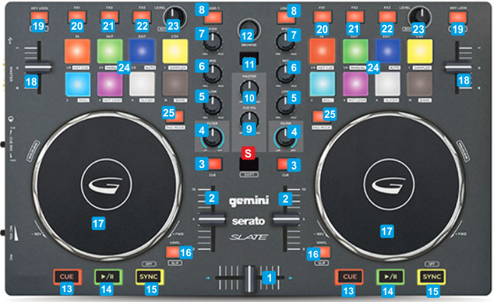 Touch-sensitive jogwheel for scratching or bending (depending on Vinyl mode)