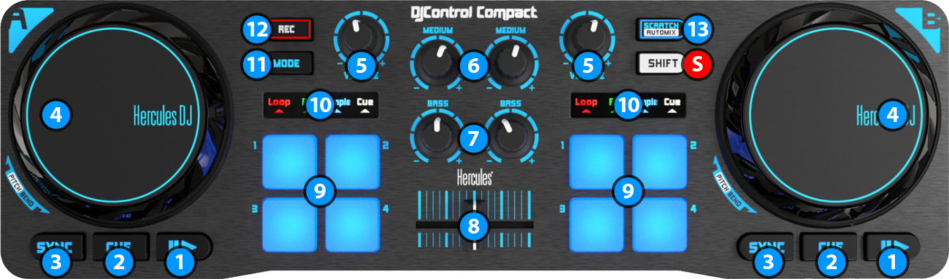 Touch-sensitive jogwheel for scratching or bending (temporary speed up/down tempo) the track, depending on the Vinyl mode.