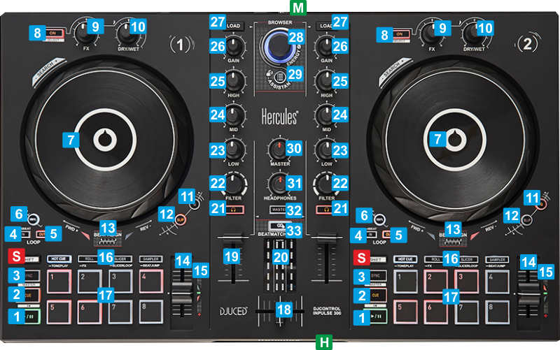 Use this button to enable/disable Beat-Match Guide. When enabled, the Beat-Align [13] and Tempo assistant [15] leds will offer their described functionality