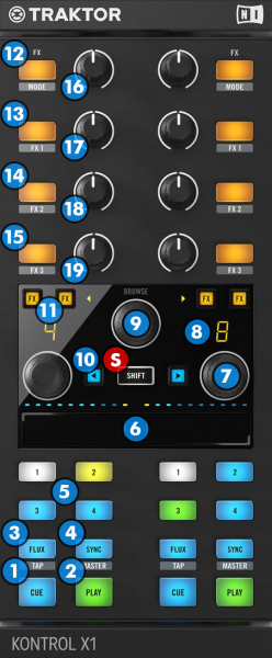 - FLUX: Enables Slip Mode. Several software functions (such as HotCues and Loops) will apply temporarily on the track, and the track will return to the position it would have been if those functions were not triggered.