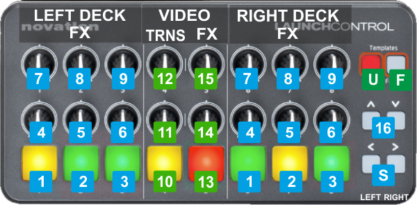 Left button is assigned as Left Deck SHIFT and Right button is assigned as Right deck SHIFT 1 PAD 1/6Turn selected Effect on/off of the 1st FX slotShow/hide the FX GUI of the selected Effect of the 1st FX Slot in Browser 2 PAD 2/7Turn selected Effect on/off of the 2nd FX slotShow/hide the FX GUI of the selected Effect of the 2nd FX Slot in Browser 3 PAD 3/8Turn selected Effect on/off of the 3rd FX slotShow/hide the FX GUI of the selected Effect of the 3rd FX Slot in Browser 4 BOTTOM KNOB 1/6Selects the Effect for the 1st FX Slot 5 BOTTOM KNOB 2/7Selects the Effect for the 2nd FX Slot 6 BOTTOM KNOB 3/8Selects the Effect for the 3rd FX Slot 7 TOP KNOB 1/6Adjust the 1st Parameter of the selected Effect of the FX Slot 1Adjust the 2nd Parameter of the selected Effect of the FX Slot 1 8 TOP KNOB 2/7Adjust the 1st Parameter of the selected Effect of the FX Slot 2Adjust the 2nd Parameter of the selected Effect of the FX Slot 2 9 TOP KNOB 3/8Adjust the 1st Parameter of the selected Effect of the FX Slot 3Adjust the 2nd Parameter of the selected Effect of the FX Slot 3 10 PAD 4Triggers the selected Video TransitionShow/hide the FX GUI of the selected Video Transition in Browser 11 BOTTOM KNOB 4Select the Video Transition 12 TOP KNOB 4Adjust the 1st Parameter of the selected Video Transition (if available)Adjust the 2nd Parameter of the selected Video Transition (if available) 13 PAD 5Triggers the selected Video EffectShow/hide the FX GUI of the selected Video Effect in Browser 14 BOTTOM KNOB 5Select the Video Effect 15 TOP KNOB 5Adjust the 1st Parameter of the selected Video Effect (if available)Adjust the 2nd Parameter of the selected Video Effect (if available) 16 LEFT/RIGHT ARROW BUTSOpen previous/next panel from the Mixer Center panels (Mixer, Video, Scratch, Master) of the default VirtualDJ skin FACTORY TEMPLATES 2-8 : MIXER CONTROLS & PADS