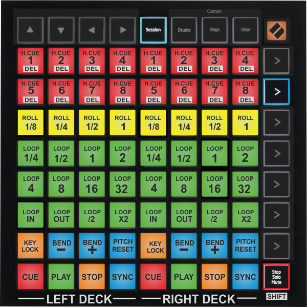 The Pads of the lower 3 rows offer Transport, Tempo and Loop controls for Left and Right decks, exactly like Pages 2 and 3,