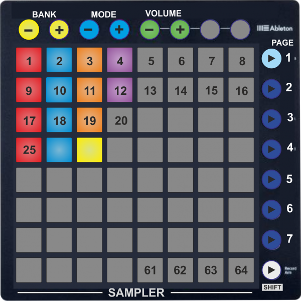 Use the top round buttons to select the next/previous Sampler Bank, the next/previous Sampler Trigger mode (On/off, Stutter, Hold and Unmute) and adjust the Master Volume of the Sampler.