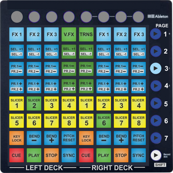 The Pads of the lower 3 rows offer Transport, Tempo and Loop controls for Left and Right decks, exactly like Pages 2 and 3,