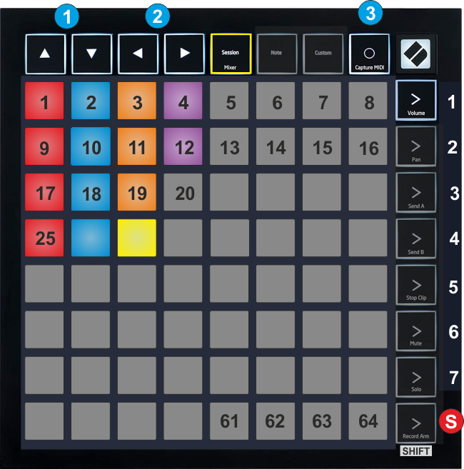 The default mapping of the Launchpad X for VirtualDJ offers 7 different pages when in SESSION mode and those can be selected by using the first 7 vertical arrow buttons of the right side of the unit.