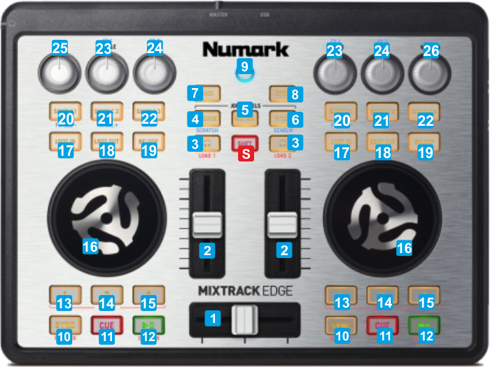 S SHIFTPress this button down to access secondary actions as described in the SHIFT ACTION column1 CROSSFADERBlends audio from Left and Right decks2 VOLUMEAdjust Output Volume of Left/Right deck3 PFLSend audio signal from Left/right deck to the Headphones channelLoad the selected track to Left/Right deck 4 BROWSESet Jogwheels to Browser mode In FX mode : Set Jogwheels to Jog mode5 CUEMIXSet Jogwheels to CueMix mode6 PITCHSet Jogwheels to Pitch mode In FX mode : Set Jogwheels to Search (Seek) mode7 BACKSet focus to Folders list. If focus is in Folders list, open/close sub-folders8 OPENIf focus is in Folders list and folder has tracks, set focus to Songs list or select/expand next folder/sub-folder if not. If focus is in Songs list, load track to selected deck9 FX MODETurn FX mode on/off (several buttons offer Effect controls - mainly in blue lettering- when this mode is enabled10 SYNCMatch BPM and phase of the deck with the opposite one. Hold for more than 1 second to reset pitch to zero/middle positionTurn Keylock (Master Tempo on/off11 CUESets a temporary Cue point when paused and preview Cue while pressed. Jumps and stops to Cue point when playing12 PLAYPlay/pauses trackPlays-stutter track from Cue point 13 HOTCUE 1Assigns or triggers (if assigned) Hotcue 1Deletes Hotcue 114 HOTCUE 2Assigns or triggers (if assigned) Hotcue 2Deletes Hotcue 215 HOTCUE 3Assigns or triggers (if assigned) Hotcue 3Deletes Hotcue 316 JOGScratch or Bend depending on the Vinyl/Scratch mode In Pitch mode : Use the jogwheels to adjust the pitch/tempo of left/right decks In Search mode : Use the jogwheel to fast search (seek) through the track In Browse mode : Use the left jogwheel to scroll through Folder and the right jogwheel to scroll through files In CueMix mode : Use jogwheels to blend signal from Master Output and Decks in the Headphones channel 17 LOOP INSets a Loop In (Start) point for a manual loopHalf the size of the Loop18 LOOP OUTSets a Loop Out (End) point for a manual loop. Exit Loop when in LoopDouble the size of the Loop19 RELOOPEnables last triggered loop. Exits loop when in loopturn Smart Loop on/off20 SAMPLE1Triggers Sample 1 In FX mode : Select previous EffectStops Sample 121 SAMPLE2Triggers Sample 2 In FX mode : Select next EffectStops Sample 222 SAMPLE3Triggers Sample 3 In FX mode : Turns selected Effect on/offStops Sample 323 TREBLEAdjust High and Mid Equalizer Band In FX mode : Adjust 1st Parameter of the selected Effect24 BASSAdjust Low (Bass) Equalizer Band In FX mode : Adjust 2nd Parameter of the selected Effect25 PFL VOLAdjust Output Volume of the Headphones channel26 MASTER VOLAdjust Volume of the Master Output channel