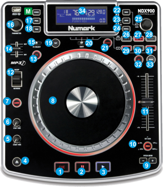 3. PLAY. Plays the track from Cue point when paused. Jumps to Cue point and continues playing when track is playing.