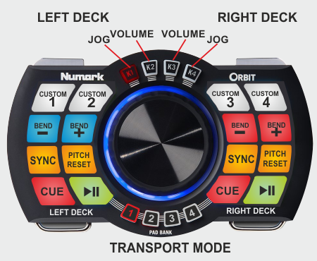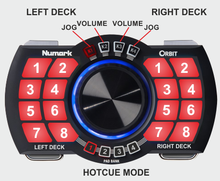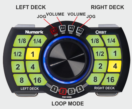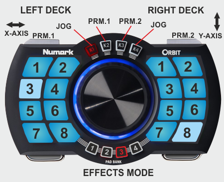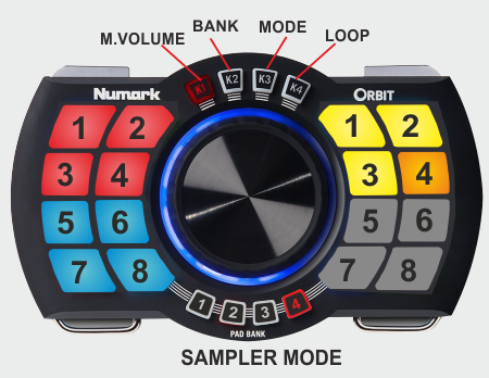 The 16 Pads of the Numark Orbit offer 7 different modes, depending on the 4 PAD BANK selection buttons. Press the same PAD BANK button again to access the additional mode