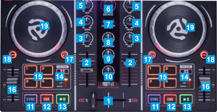 1 CROSSFADERBlends audio signals from left and right decks2 VOLUMEAdjust Volume Output for Left and Right deck3 BASSAdjust the Low (Bass) Equalizer Band4 TREBLEAdjust the High (Treble) and Mid Equalizer Band5 GAINAdjust the pre-fader Output Level6 BROWSEScroll through Folders or Tracks Push to toggle focus between Folders and Songs List. When in Folders list, push for more than 1 second to expand/collapse sub-folders7 LOADLoad the selected track to Left/Right deck. Hold for more than 1 second to unload the same deck8 MASTER GAINAdjust the Volume of the Master Output9 CUE MIXRoutes Master Output to the Headphones Channel when in maximum position. Routes decks (when PFL is enabled) to the Headphones Channel Blends Master Output and Decks (if PFL is enabled) in all other positions10 CUE GAINAdjust the Volume of the Headphones Output11 SYNCMatch BPM and Beat Phase with the opposite deck12 CUESets current position as Temporary Cue point. Preview track when paused while button is pressed Jumps and stops to the Cue point when playing13 PLAYPlay/Pause track14 PAD MODESCycles through the Pad modes (Hotcues, Loops, Sampler and Effects). See Pads15 PADS 1-4The 4 numbered Pads offer different functionality depending on the selected Pad mode. See Pads16 PITCHAdjust track's tempo (BPM)17 PFLSends pref-dader audio signal to the Headphones channel (for pre-listening)18 SCRATCHToggles between Scratch (Vinyl) and Bend (CD) mode for the Jogwheel19 JOGScratch (when Scratch mode is enabled) or Bend (when Bend mode is enabled)