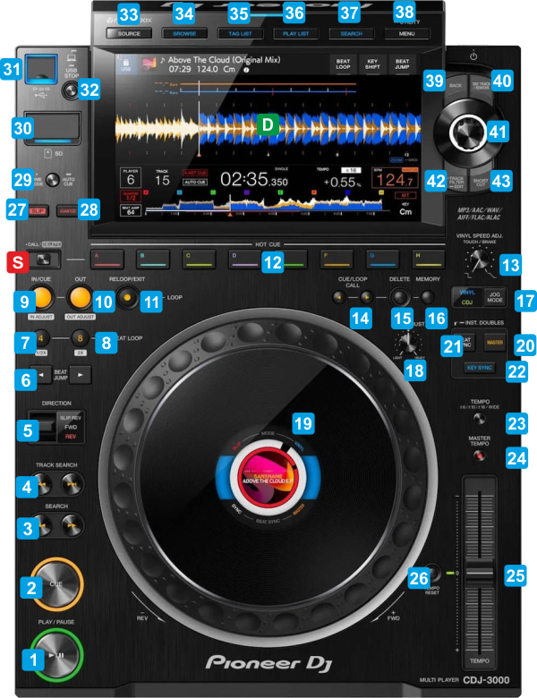 Hold SHIFT down and then use this button to cycle through Hotcues, Stems and Sampler mode for the HOTCUE buttons17 JOG MODESelect the VINYL or CDJ mode for the Jogwheel18 JOG ADJUSTAdjust how heavy or light the Jogwheel will be19 JOGWHEELUse the jogwheel to scratch, pitch-bend or adjust the entry and exit loop positions. When VINYL mode is enabled, use the upper/inner part of the wheel to scratch the track backwards/forward and the outer part (side) to pitch-bend (temporary speed-up/slow-down tempo) When CDJ mode is enabled use any part of the jogwheel to pitch-bend (temporary speed-up/slow-down tempo) See LOOP controls for loop in/out adjust. The small LCD screen will display the Album Art of the loaded track, the CUE position and a track rotation marker20 MASTERUse this button to manually set the Deck as Master. When a Deck is set as Master, all other Decks will sync to the Master Deck, if SYNC is pressed.21 BEAT SYNCUse this button to synchronize Tempo (BPM) and Beat phase to the other Deck or Master Deck - if more than 2 Decks are used.22 KEY SYNCUse this button to match the Key of the track with the opposite Deck. Press again to reset the Track's key back to its original value.23 TEMPO RANGEUse this button to select the % range for the Pitch fader. On each press, the range will cycle through 6,10,16 and 100%. The selected range is displayed on the LCD of the unit24 MASTER TEMPOUse this button to enable/disable Master Tempo (Keylock). When enabled, pitch/tempo changes will not affect the Key of the track25 TEMPOUse this fader to adjust the tempo (BPM) of the track. In middle position, the track will play at its original tempo (BPM). The pitch% and BPM value are displayed on the LCD of the unit.26 TEMPO RESETUse this button to gradually reset Track's tempo back to its original value.27 SLIPEnable/disable Slip mode. When enabled, several actions such as holding the platter, loop and Hotcues will act temporarily and once performed, track will resume to the position it would have been if the action was never performed28 QUANTIZEEnable/disable Quantize mode. When enabled, several actions such as loops and Hotcues will be quantized (snapped) to the nearest beat or other beat fraction depending on the globalQuantize value (from VirtualDJ Settings)29 TIME MODEToggle between Elapsed and Remain Time view. Hold down for more than 1 second to enable/disable AutoCue. When enabled, tracks will loaded at the first available Hotcue position30 SDInsert a compatible SD card. This source is not used when the device is assigned to VirtualDJ31 USBInsert a compatible USB media storage device. This source is not used when the device is assigned to VirtualDJ32 USB STOPPress and hold this button to eject a USB device. This operation is not used when the device is assigned to VirtualDJ33 SOURCEUse this button to select a Source for the device. When the device is connected to a computer running VirtualDJ, select the CONTROL MODE (CDJ), then press the BROWSE rotary [41] to apply your sleection34 BROWSEUse this button to toggle between the Library/Browser and Deck view35 TAG LISTNo functionality is offered in CONTROL MODE36 PLAYISTNo functionality is offered in CONTROL MODE37 SEARCHNo functionality is offered in CONTROL MODE38 MENUPress and hold this button to enter the CDJ-3000 Utilities menu and adjust screen and jogwheel brightness. No other functionality is offered in CONTROL MODE39 BACKWhen in Browser view mode, use this button to get the Folders list view. If focus is in Folder view, use this button to open/close sub-folders (if exist)40 TAG TRACKNo VirtualDJ functionality is assigned to this button41 BROWSE ROTARYWhen in Decks view, use this rotary to zoom in/out the waveform of the loaded track. When in Browser view : Use the rotary to scroll through files or folders. Push the rotary to see the tracks of the selected folder (if in Folders view) or load the selected track to the Deck (if in Tracks list view)42 TRACK FILTERNo VirtualDJ functionality is assigned to this button43 SHORTCUTUse this button to get a screen with Shortcuts/Setting. When using VirtualDJ (CONTROL MODE) only the Brightness settings are available. No other VirtualDJ functionality is assigned to this button Display