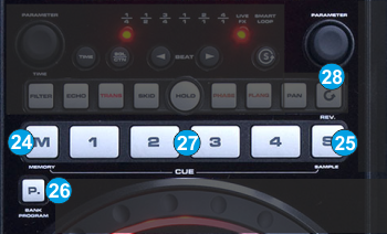 - CUE/SAMPLE (1-4). These buttons offer a different function depending on the selected mode and bank.