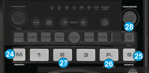 - SAMPLE. Press this button to set the 3 numbered buttons (27) to Sampler mode. Press and hold this button for more than 1 second to open/close the Sideview and offer the Sampler View as well.
