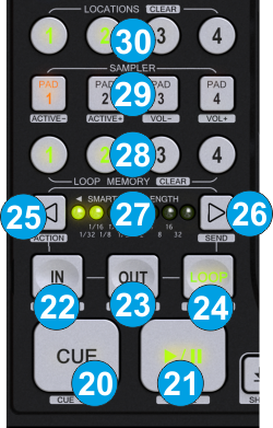 Hold SHIFT down and then use these buttons to stop the playing Sample. Useful when the Un-mute or Stutter Sampler trigger mode is selected. - LOCATION BUTTONS. Use these buttons to save, recall and delete Hotcues 1 to 4. When a Hotcue is not assigned, use a button to save current track's position to Hotcue 1 to 4. Use the same button to recall and jump the track to that position. Hold SHIFT down and then use the same button to delete its assigned Hotcue.