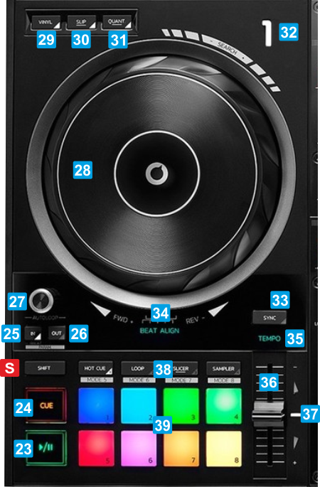 Touch-sensitive jogwheel for scratching or bending (temporary speed up/down tempo) the track, depending on the Vinyl mode.