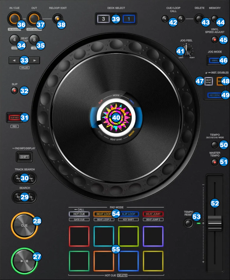 VINYL SPEED ADJUST. Press this button to enable the Vinyl Speed emulation mode when using the PLAY/PAUSE button.