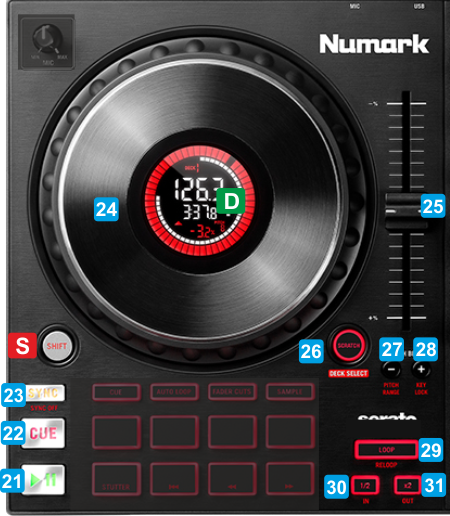 S SHIFTPress this button down to access secondary actions as described in the SHIFT ACTION column21 PLAYPlay/pause deckPlays deck when paused. Jumps to Cue point and continues to play from there when deck is playing (play-stutter)22 CUESets a temporary Cue point when deck is paused and preview track while pressed. Jumps and stops to the Cue point when deck is playingJumps and stops at the beginning of the track 23 SYNCMatches track's tempo and pahse with the ones of the Master Deck.Reset Track's tempo to original value (same as having the Pitch fader to center position24 JOGTouch-sensitive jogwheel for scratch, bend, loop adjust. In Scratch mode (SCRATCH button lit), use the top side of the jogwheel to scratch and the outer side to bend (temporary slow-down/speed-up).