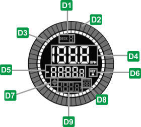 D1 DECK#Displays the number of the Deck assigned on the Left/Right side of the Platinum FXD2 RED RINGIndicates the current track's position of the software jogwheel - shows rotationD3 WHITE RINGIndicates the track's position in time, starting with an empty circle and ending to a full circle when track reaches its end. The white circle will start blink when track reaches near the end of the trackD4 BPMDisplays the current BPM value of the trackD5 TIMEDisplays the Remain (with a minus mark) or the Elapsed Time of the track.Time Display is toggled between Elapsed and Remain via SHIFT+CUE(PFL) button.D6 KEY LOCKWill be displayed when the Key-Lock (Master Tempo) is enabled on the deckD7 PITCH ARROWThe down arrow will be displayed when Pitch has a positive value (track's speed higher than original) The up arrow will be displayed when Pitch has a negative value (track's speed lower than original) None of the arrows will be displayed when Pitch is at the zero/middle position (track's speed equal to original)