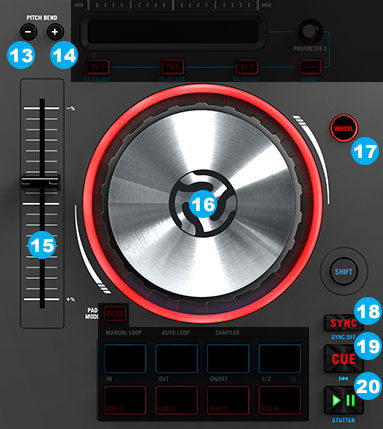 Jog wheel: Controls the audio when the wheel is touched and moved. When the Wheel (Vinyl) button (17) is not active, use the jog wheel to bend the pitch of the track. When the Wheel button is active, use the jog wheel to grab and move the audio, "scratching" the track as you would with a vinyl record. You can also grab the non-touch-sensitive outer wheel to bend the pitch of the track.