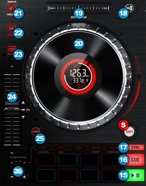 JOG: Touch sensitive jogwheel. Use the jogwheel to scratch (if Vinyl mode is selected) or pitch bend. Hold SHIFT down and then use the Jogwheel to fast search through the track, but keep the phase synced. The Jogwheel also offers Loop In and Loop Out point adjustment (see Manual Loop Pads mode)