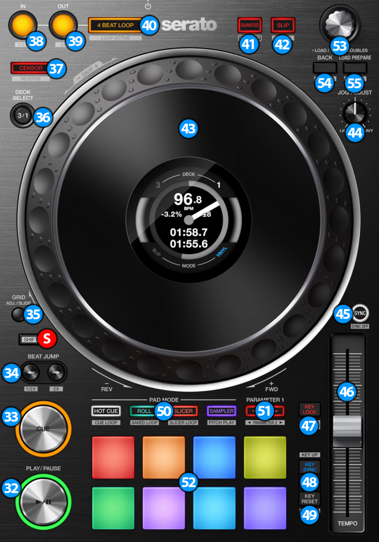 SSHIFT. Press and hold this button to access secondary functions (black lettering in gray box) of other controls on the DDJ-1000SRT