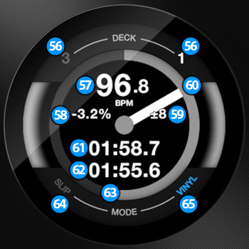 JOGWHEEL. Pressure sensitive platter for scratching (Vinyl Mode) or bending (CD Mode).